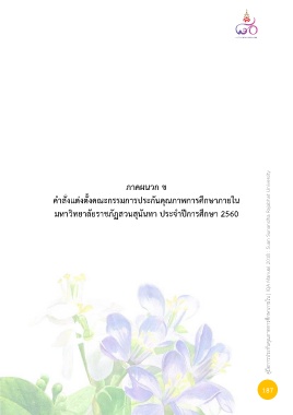 ภาคผนวก ช ค าสั่งแต่งตั้งคณะกรรมการประกันคุณภาพการศึกษาภายใน มหาวิทยาลัยราชภัฏสวนสุนันทา ประจ าปีการศึกษา 2560 คู่มือการประกันคุณภาพการศึกษาภายใน | IQA Manual 2018 : Suan Sunandha Rajabhat University 187