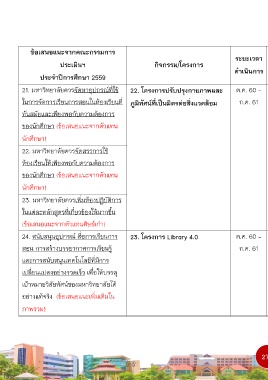 24. สนับสนุนอุปกรณ์ สื่อการเรียนการ 23. โครงการ Library 4.0 ต.ค. 60 - 180,200 ระดับความพึงพอใจของ ระดับ 4.47 ≥ ระดับ 4.47 - อธิการบดี