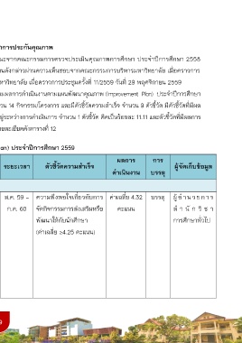 2559 พบว่า มีโครงการ/กิจกรรมตามแผนพัฒนาคุณภาพ (Improvement Plan) จ านวน 14 กิจกรรม/โครงการ และมีตัวชี้วัดความส าเร็จ จ านวน 9 ตัวชี้วัด มีตัวชี้วัดที่มีผล