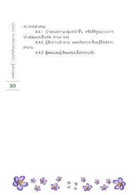 องค์ความรู้ ประจ าปีงบประมาณ 2560 4) การน าเสนอ 4.4.1 น าเสนองานกลุ่มหน้าชั้น หรือใช้รูปแบบการ น าเสนอแบบอื่นเช่น Snow ball 4.4.2 ผู้ฟังถามค าถาม และเกิดการเรียนรู้ใหม่จาก ค าถาม 4.4.3 ผู้สอนและผู้เรียนสรุปเนื้อหาร่วมกัน