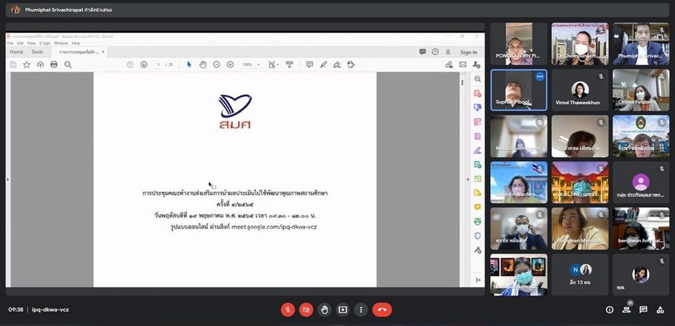 วันนี้ (19 พฤษภาคม 2565) เวลา 09.30 น. รศ.ดร.วิทยา เมฆขำ รองอธิการบดีฝ่ายแผนงานและประกันคุณภาพ พร้อมด้วย ผศ.ดร.กรรณิการ์ ภิรมย์รัตน์ และบุคลากรฝ่ายประกันคุณภาพและการจัดการความรู้ เข้าร่วมประชุมคณะทำงานส่งเสริมการนำผลประเมินไปใช้พัฒนาคุณภาพสถานศึกษาครั้งที่ 4/2565 ผ่านระบบออนไลน์ Google Meet เพื่อรายงานความก้าวหน้าในการนําร่องส่งเสริมนําผลประเมินไปใช้ระยะที่ 2 ในแผนการดําเนินงานในระยะต่อไป รวมถึงการเสนอรายชื่อสถานศึกษากลุ่มเป้าหมาย (ครอบคลุม 18 ภูมิภาค), (ร่าง) หลักเกณฑ์การรับรองศูนย์ประสานงาน และ (ร่าง) หลักเกณฑ์การรับรองผู้ทรงคุณวุฒิ