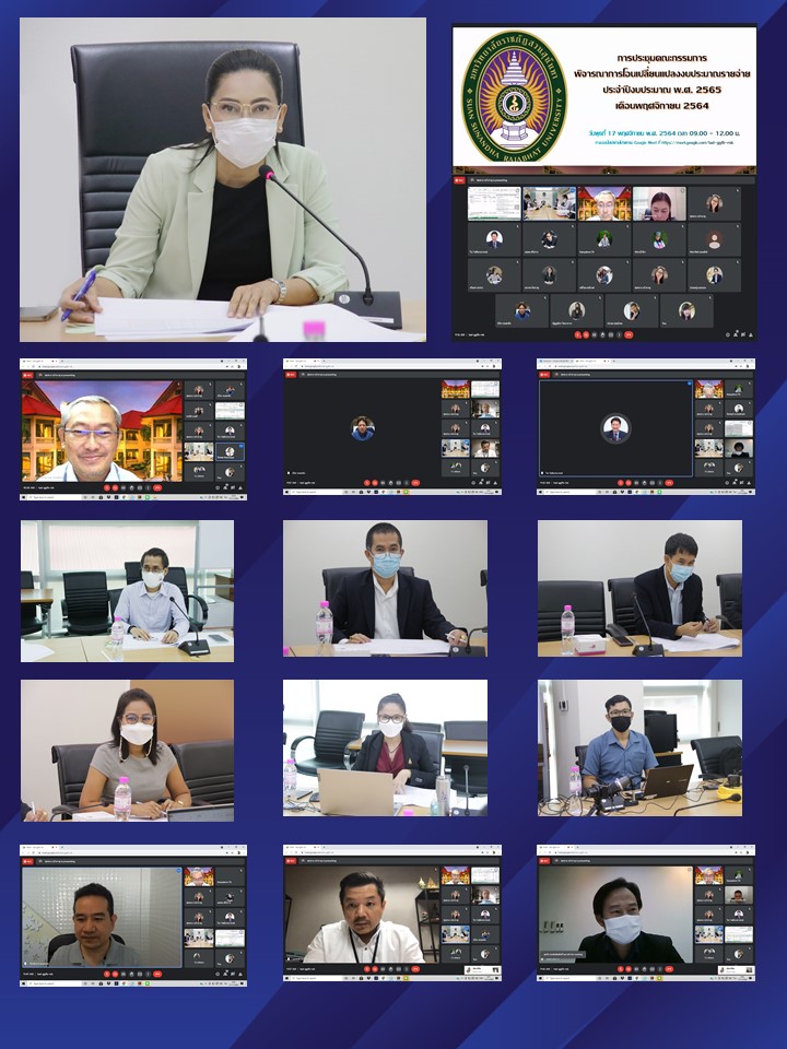 วันที่ 17 พฤศจิกายน 2564 เวลา 9.30 น. ฝ่ายติดตามงบประมาณและสารสนเทศ กองนโยบายและแผน จัดการประชุมคณะกรรมการพิจารณาโอนเปลี่ยนแปลงรายการงบประมาณ ประจำปีงบประมาณ พ.ศ. 2565 (เดือนพ.ย. 2564) มีรศ. ดร.ชุติกาญจน์ ศรีวิบูลย์ อธิการบดีมหาวิทยาลัยราชภัฏสวนสุนันทา เป็นประธาน โดย รศ.ดร.วิทยา เมฆขำ รองอธิการบดีฝ่ายแผนงานและประกันคุณภาพ ร่วมประชุมพร้อมผู้เกี่ยวข้อง ผ่านระบบออนไลน์ Google Meet