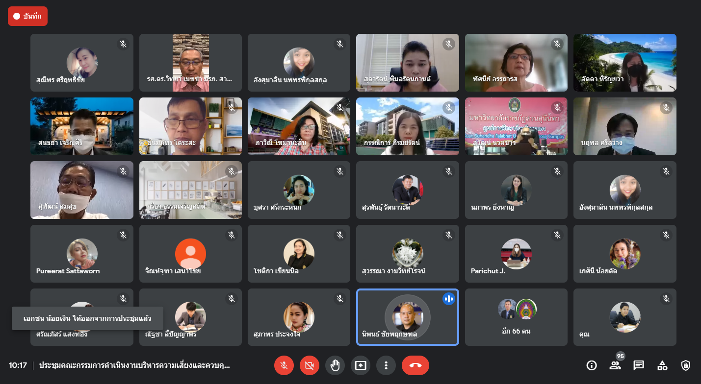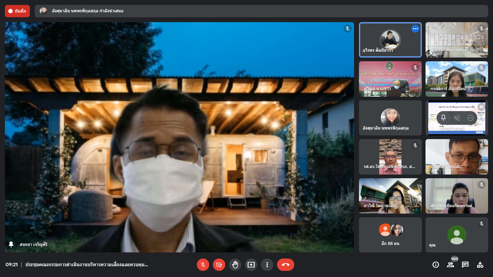 วันที่ 23 กันยายน พ.ศ.2564 เวลา 09.00 น. รศ.ดร.วิทยา เมฆขำ รองอธิการบดีฝ่ายแผนงานและประกันคุณภาพเป็นประธานประชุมคณะกรรมการดำเนินงานและคณะอนุกรรมการดำเนินงานบริหารความเสี่ยงและควบคุมภายใน ประจำปีงบประมาณ พ.ศ.2565 เพื่อแจ้งปฏิทินการดำเนินงานบริหารความเสี่ยงและควบคุมภายใน และ พิจารณา (ร่าง) ประเด็นความเสี่ยง และเกณฑ์ที่ใช้ในการประเมินความเสี่ยง (โอกาสและผลกระทบ) ประจำปีงบประมาณ พ.ศ. 2565 ผ่านระบบประชุมออนไลน์โปรแกรม Google Meet