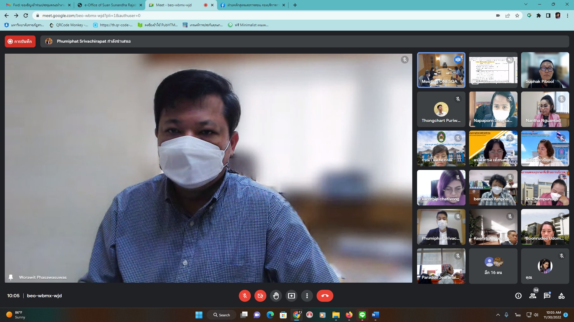 วันที่ 30 พ.ย. 65 เวลา 09.30 น. รศ.ดร.วิทยา เมฆขำ รองอธิการบดีฝ่ายแผนงานและประกันคุณภาพ มอบหมายให้ ผศ.ดร.กรรณิการ์ ภิรมย์รัตน์ คณบดีคณะครุศาสตร์ ผศ.ดร.บุญฤดี อุดมผล อาจารย์คณะครุศาสตร์ และบุคลากรฝ่ายประกันคุณภาพฯ กองนโยบายและเเผน เข้าร่วมประชุมคณะทำงานส่งเสริมการนำผลประเมินไปใช้พัฒนาคุณภาพการศึกษา ครั้งที่ 1/2566 เพื่อขับเคลื่อนการส่งเสริมการนำผลประเมินไปใช้ใน 18 กลุ่มจังหวัด และรายงานผลการดำเนินงานโครงการส่งเสริมการนำผลประเมินไปใช้พัฒนาคุณภาพสถานศึกษาของสำนักงานเขตพื้นที่การศึกษา บุรีรัมย์ เขต 1 ผ่านระบบออนไลน์ Google Meet
