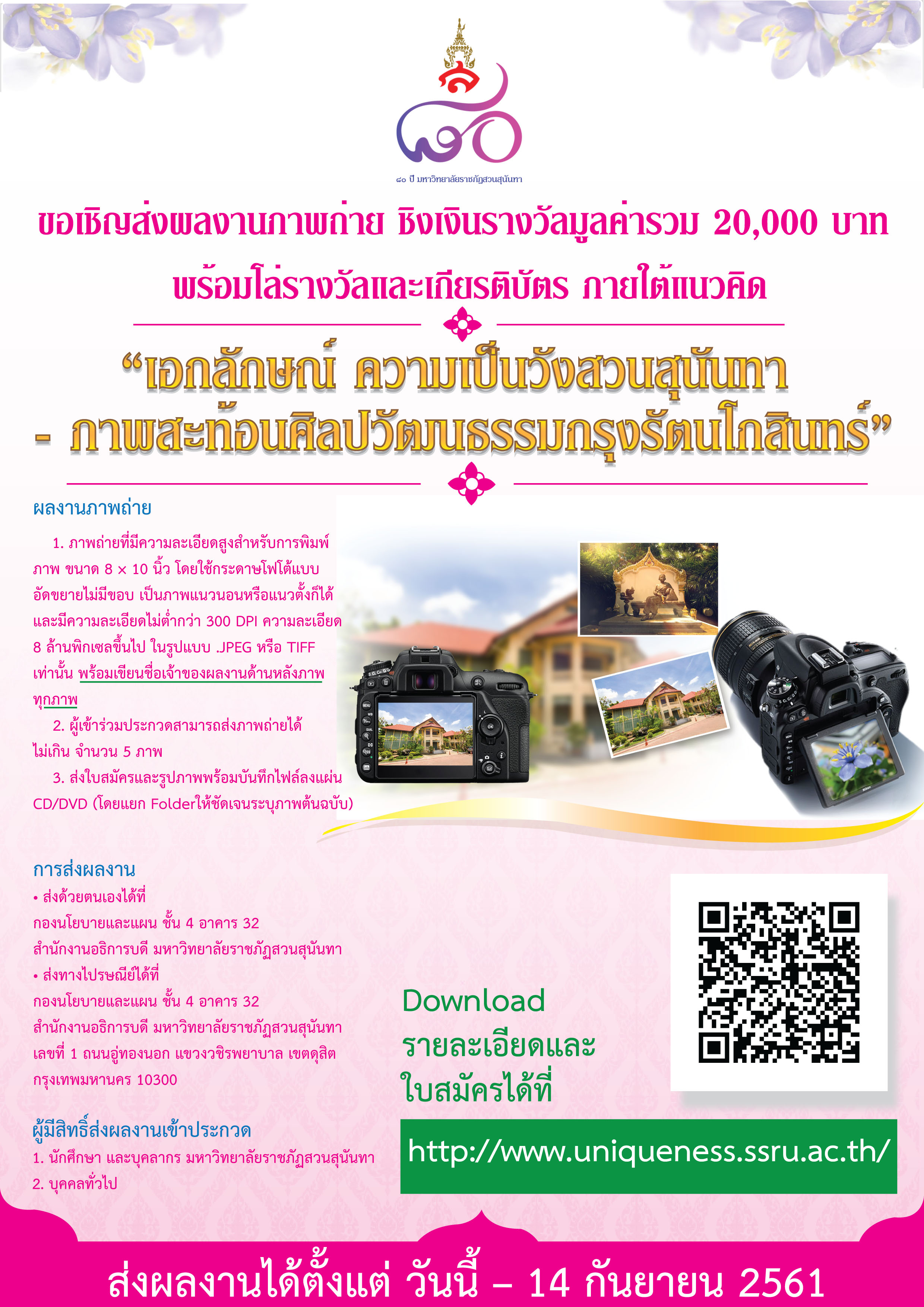 ขอเชิญบุคคลทั่วไป นักศึกษา และบุคลากร มหาวิทยาลัยราชภัฏสวนสุนันทา ส่งผลงานภาพถ่าย ชิงเงินรางวัลมูลค่ารวม 20,000 บาท พร้อมโล่รางวัลและเกียรติบัตร ภายใต้แนวคิด “เอกลักษณ์ ความเป็นวังสวนสุนันทา – ภาพสะท้อนศิลปวัฒนธรรมกรุงรัตนโกสินทร์” ส่งผลงานได้ตั้งแต่ วันนี้ – 14 กันยายน 2561
