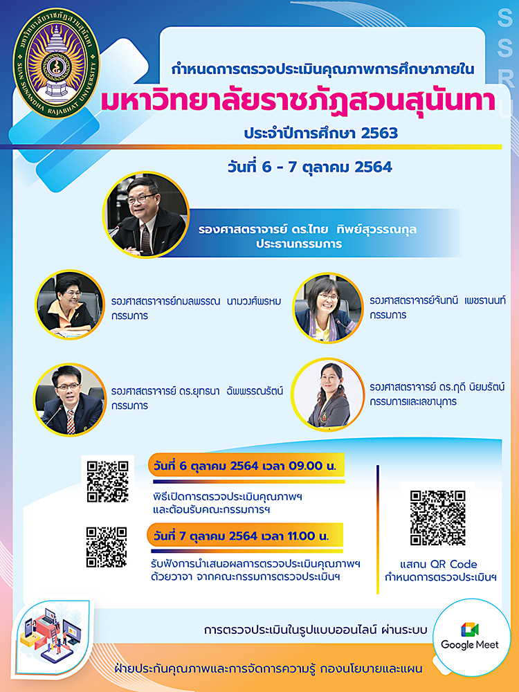 ขอเรียนเชิญ คณะผู้บริหาร คณาจารย์ บุคลากรและผู้มีส่วนเกี่ยวข้องทุกท่านเข้าร่วมการประเมินคุณภาพการศึกษาภายใน มหาวิทยาลัยราชภัฏสวนสุนันทา ประจำปีการศึกษา 2563 ระดับสถาบัน ระหว่างวันที่ 6-7 ตุลาคม 2564 ในรูปแบบ Online ผ่านโปรแกรม Google Meet