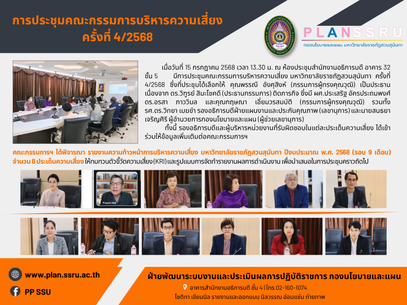เมื่อวันที่ 15 กรกฎาคม 2568 เวลา 13.30 น. ณ ห้องประชุมสำนักงานอธิการบดี อาคาร 32 ชั้น 5 มีการประชุมคณะกรรมการบริหารความเสี่ยง มหาวิทยาลัยราชภัฏสวนสุนันทา ครั้งที่ 4/2568 ซึ่งที่ประชุมได้เลือกให้ คุณพรรณี อังศุสิงห์ (กรรมการผู้ทรงคุณวุฒิ) เป็นประธาน เนื่องจาก ดร.วิฑูรย์ สิมะโชคดี (ประธานกรรมการ) ติดภารกิจ ซึ่งมี ผศ.ประเสริฐ อัครประถมพงศ์ ดร.อรสา ภาววิมล และคุณกฤษณา เอี่ยมวรสมบัติ (กรรมการผู้ทรงคุณวุฒิ) รวมทั้ง รศ.ดร.วิทยา เมฆขำ รองอธิการบดีฝ่ายแผนงานและประกันคุณภาพ (เลขานุการ) และนายสนธยา เจริญศิริ ผู้อำนวยการกองนโยบายและแผน (ผู้ช่วยเลขานุการ)