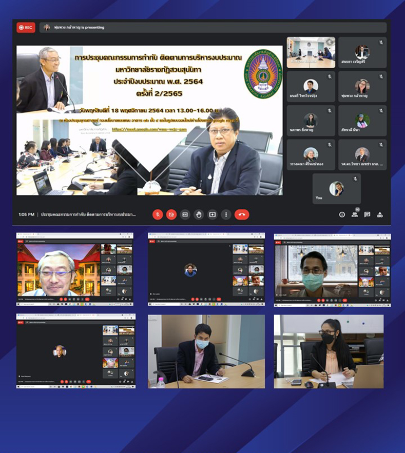วันพฤหัสบดีที่ 18 พ.ย. 64 เวลา 13:00 น. ฝ่ายติดตามงบประมาณและสารสนเทศ กองนโยบายและแผน ประชุมคณะกรรมการกำกับ ติดตามการบริหารงบประมาณ มหาวิทยาลัยราชภัฏสวนสุนันทา ประจำปีงบประมาณ พ.ศ. 2565 ครั้งที่ 2/2565 รศ.ดร.วิทยา เมฆขำ รองอธิการบดีฝ่ายแผนงานและประกันคุณภาพ เป็นประธานประชุม ผ่านระบบประชุมออนไลน์โปรแกรม Google Meet